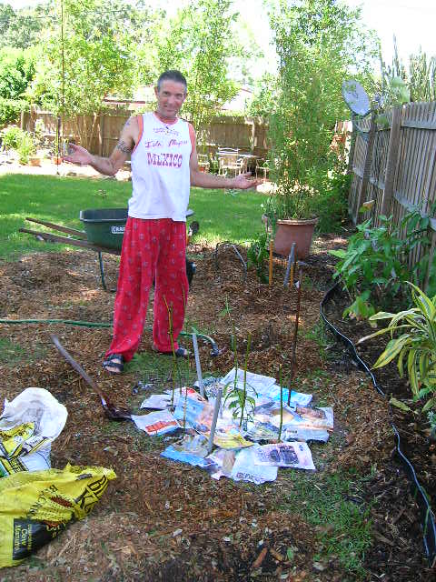 The more newspaper that is used- the better job it will do at keeping the weeds down. (Red pants NOT for sale! :)